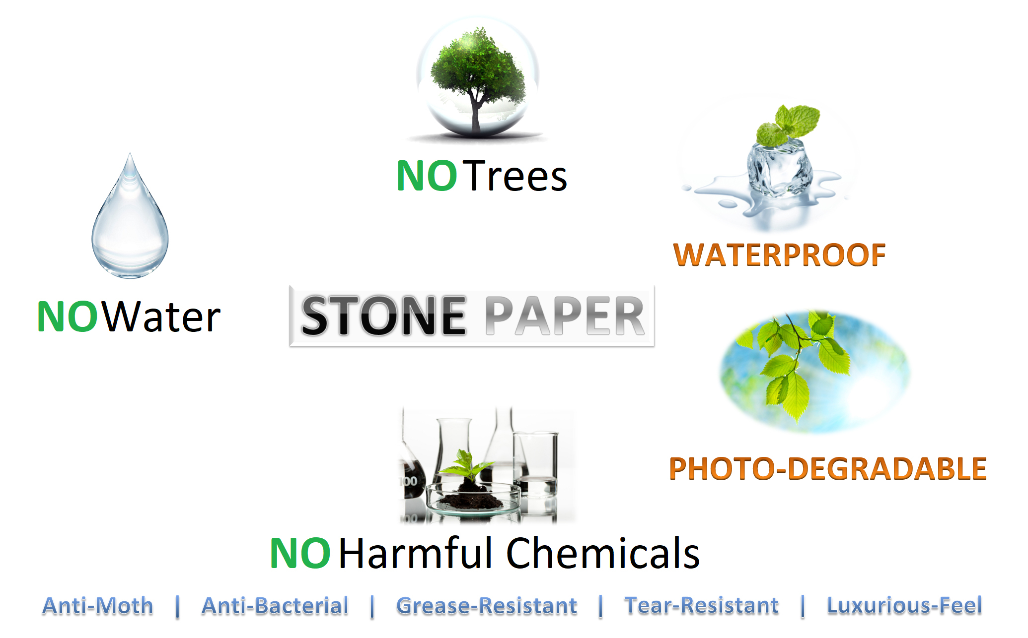 Proprietary machinery utilizing patented technology binds the Calcium Carbonate to HDPE in varying consistencies in order to make Stone Pellets which are further processed in the factory to ultimately make Stone Paper. All paper waste at the end of the Stone Paper manufacturing life-cycle is collected and recycled back into Stone Pellets which are again utilized in the Stone Paper manufacturing process.